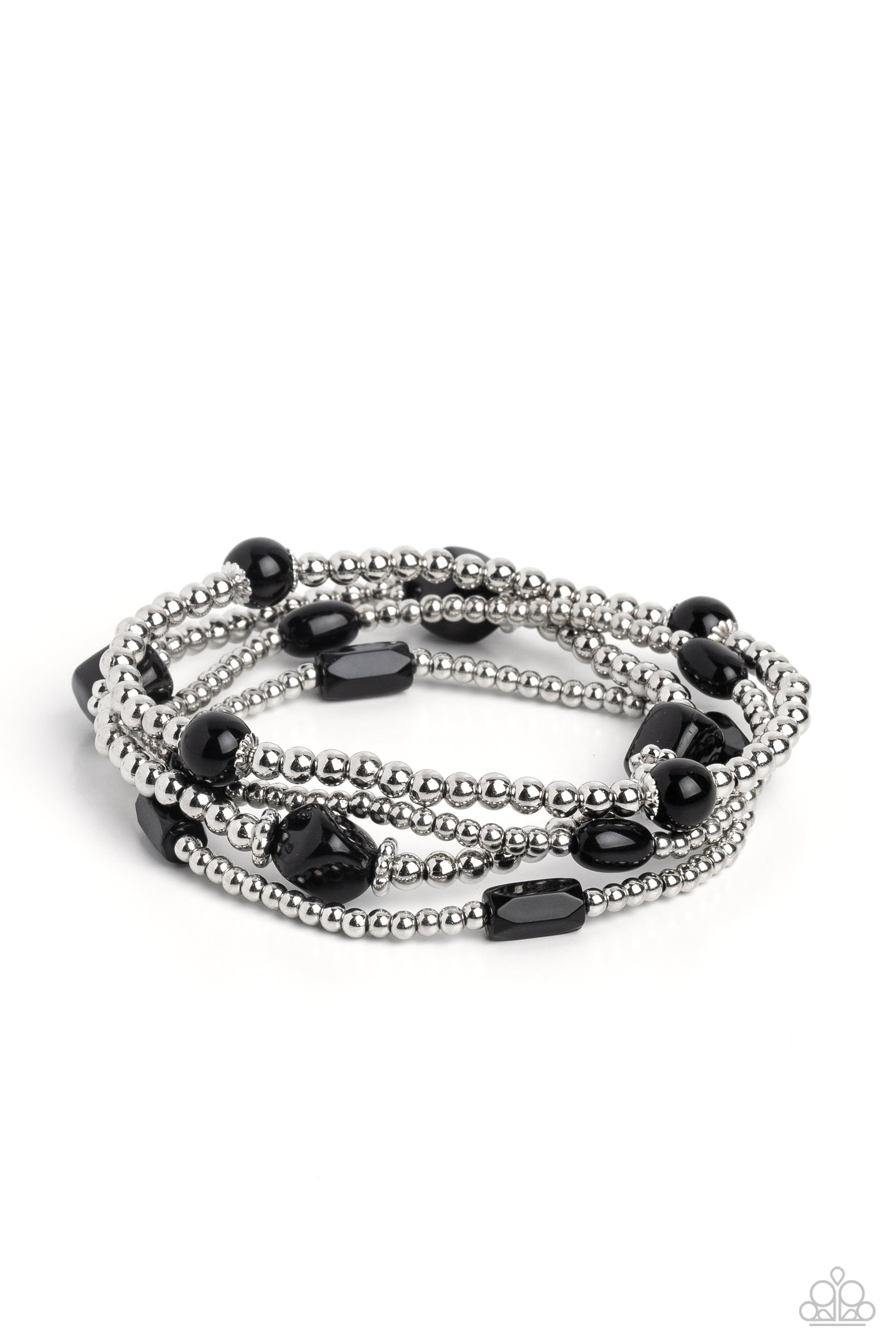 Dainty silver beads, silver accents, and black acrylics in milky, transparent, and solid shades wrap around the wrist on elastic stretchy bands for a colorfully geometric display.